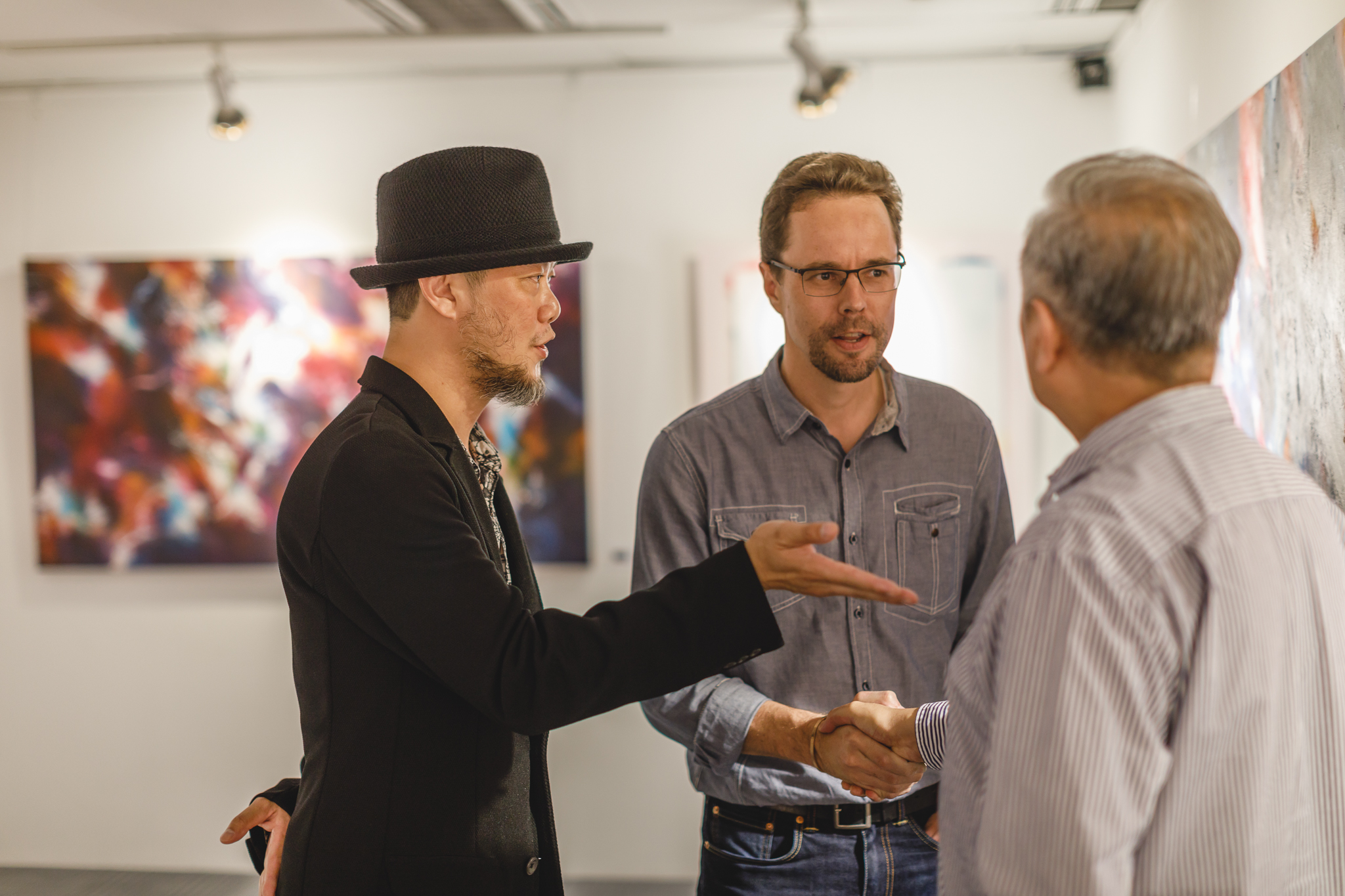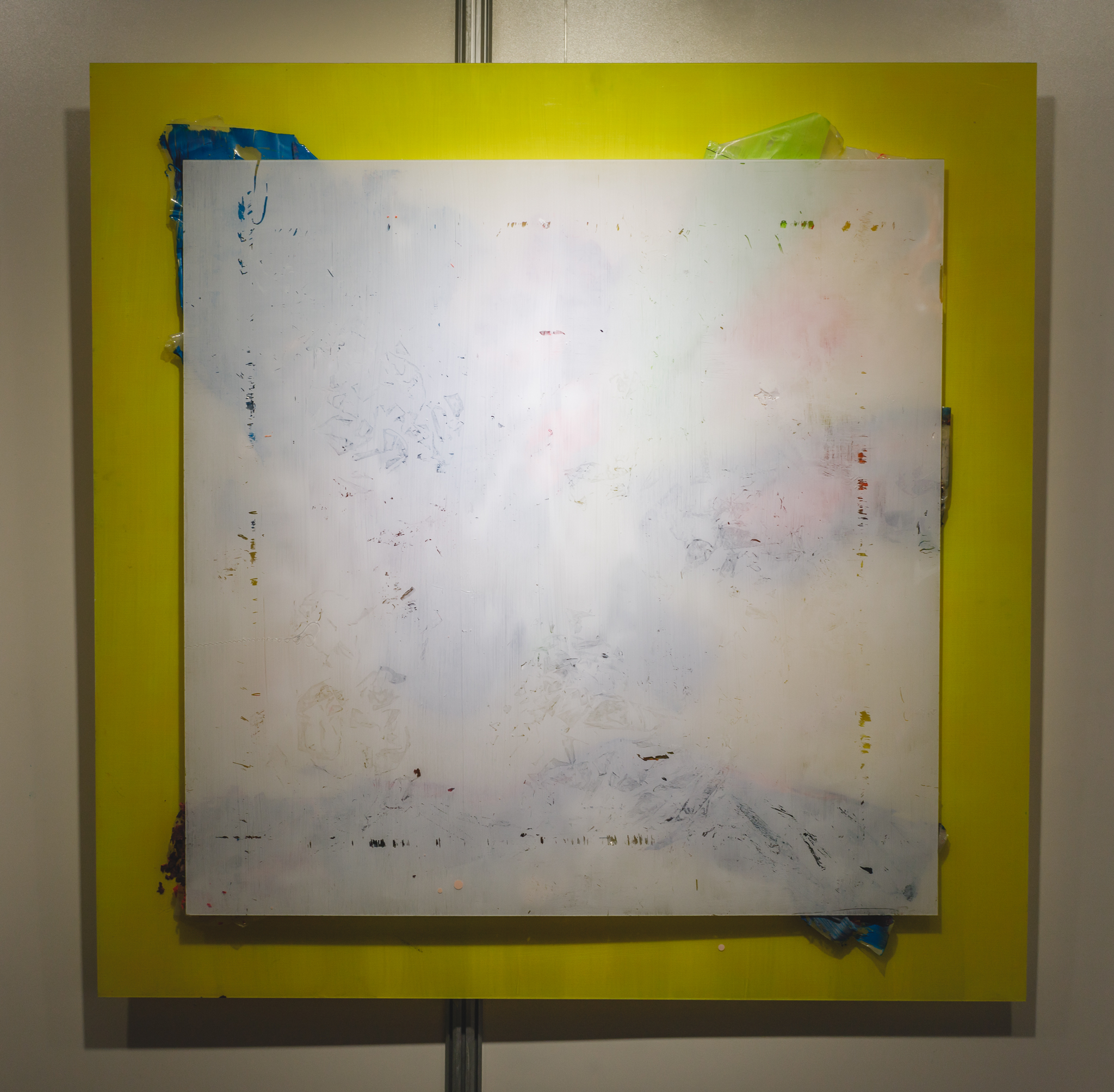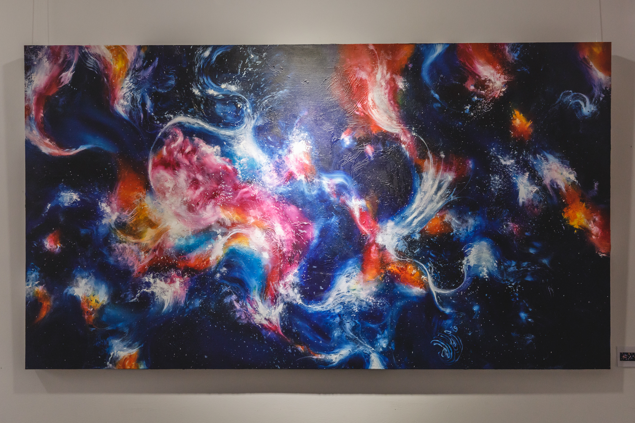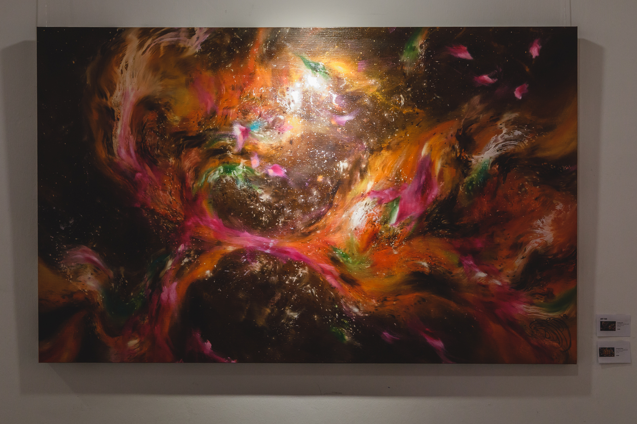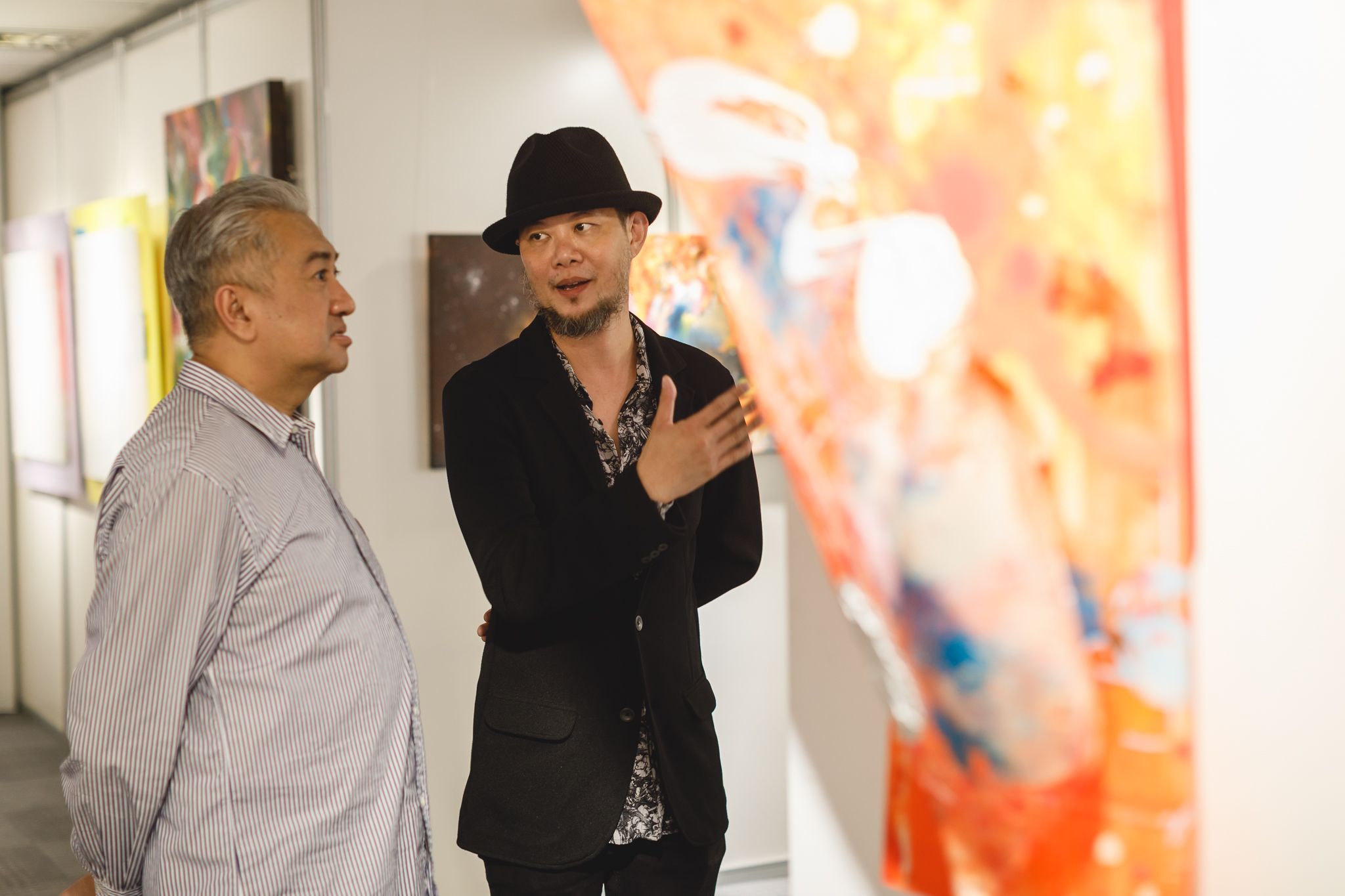 Between layers of plexiglass are gestures of Deusa Blümke, encased and amalgamated into an abstraction. Blümke’s unique process of ‘listening’ to shapes and colours synchronizes with Czech-born philosopher Vilem Flusser’s understanding that the painter “is in the gesture of painting.” This embodiment is further energized when Blümke views her paintings as live organisms in celebrating the energy and momentum of life. Tuning into the frequency of paint is also epitomized by Andy Yang. Operating under musical stimuli, Yang implements antithetical techniques to dilute his control as a deliberate action to allow various forms of gestures to harmonize. This approach is Yang’s independent Harmonic major scale in which he operates in.