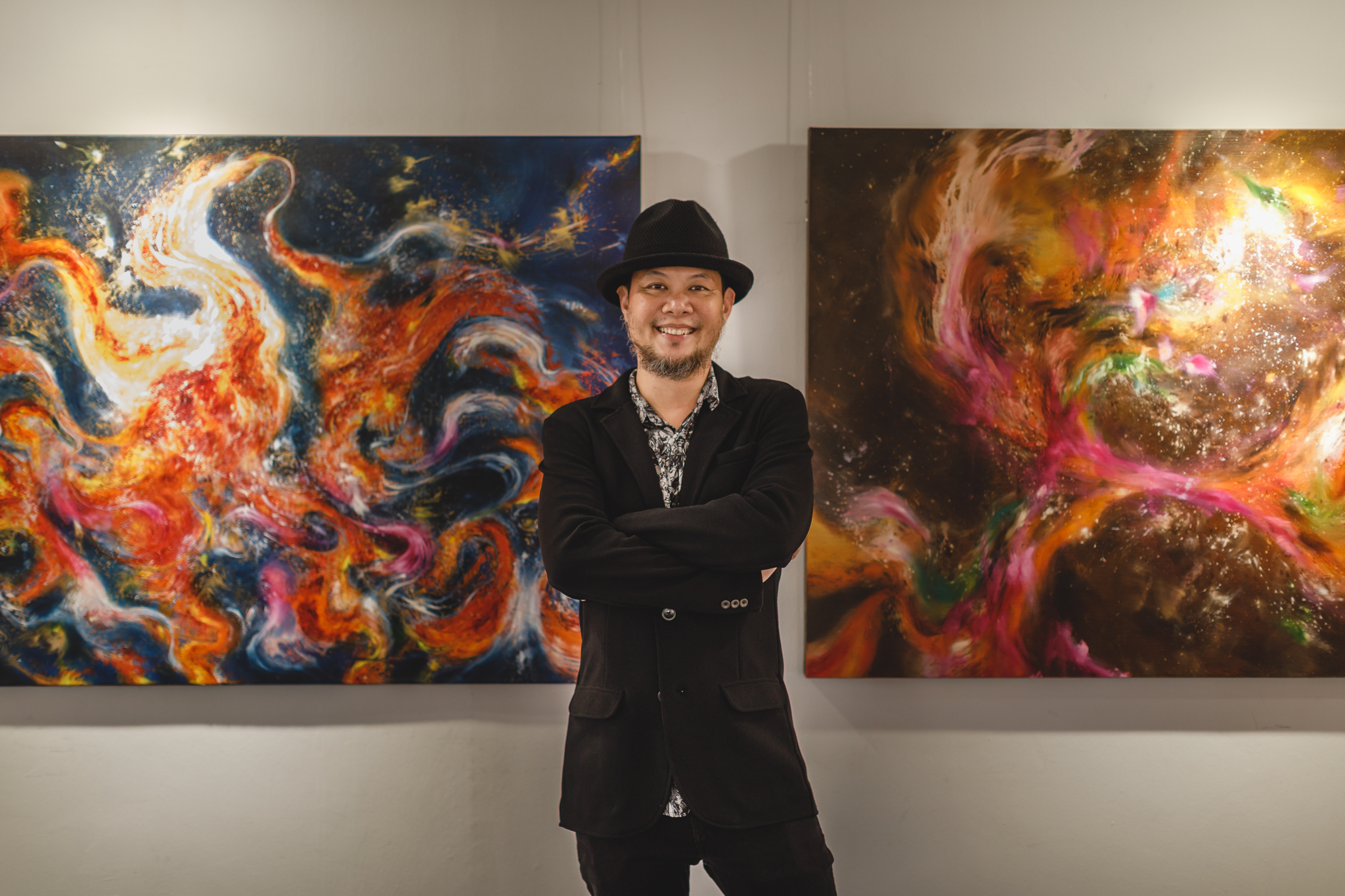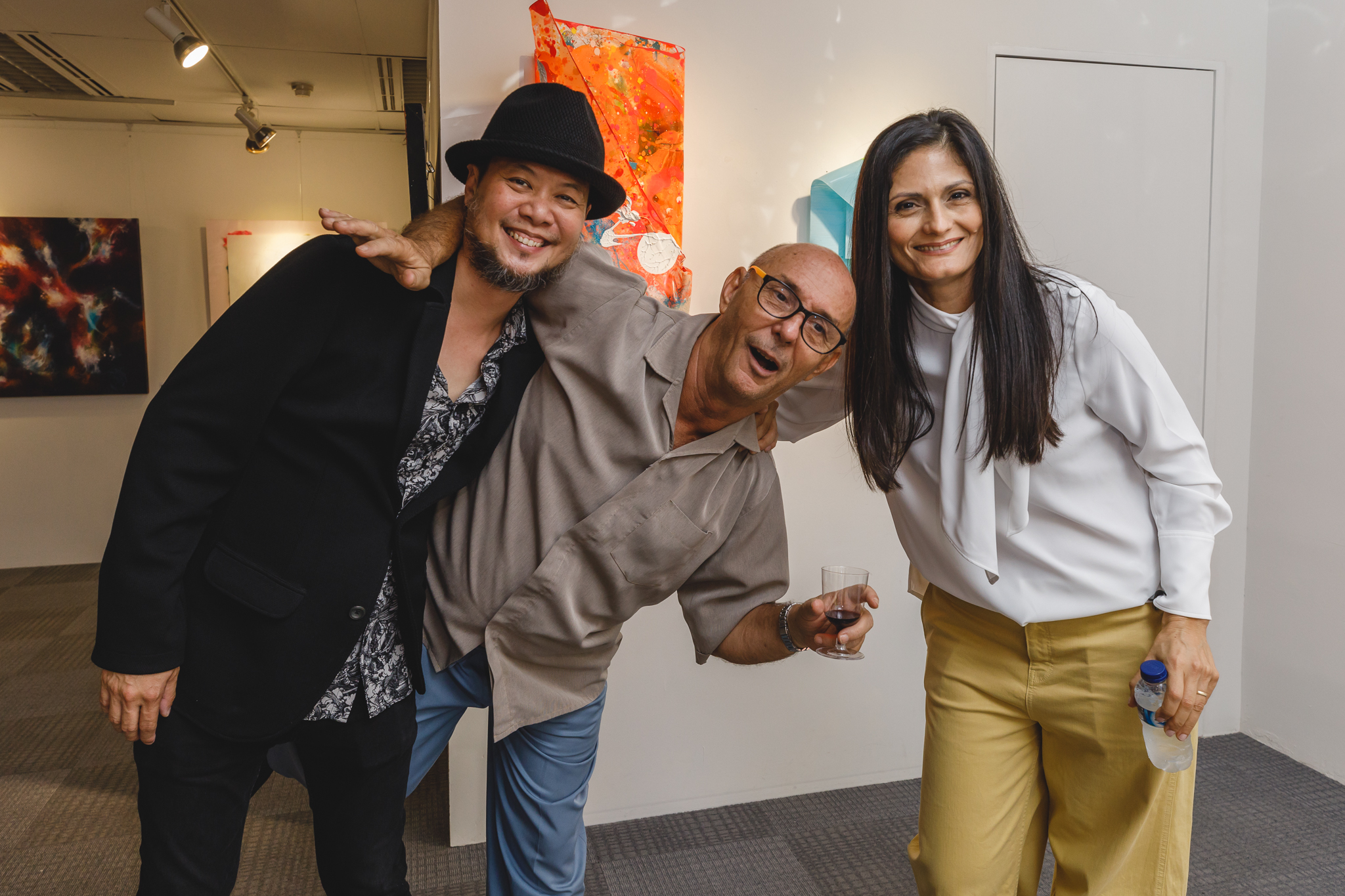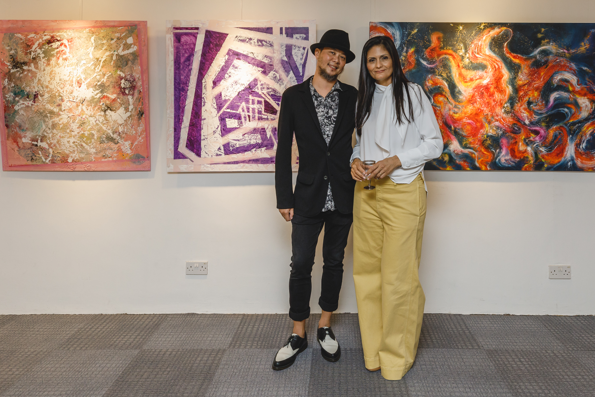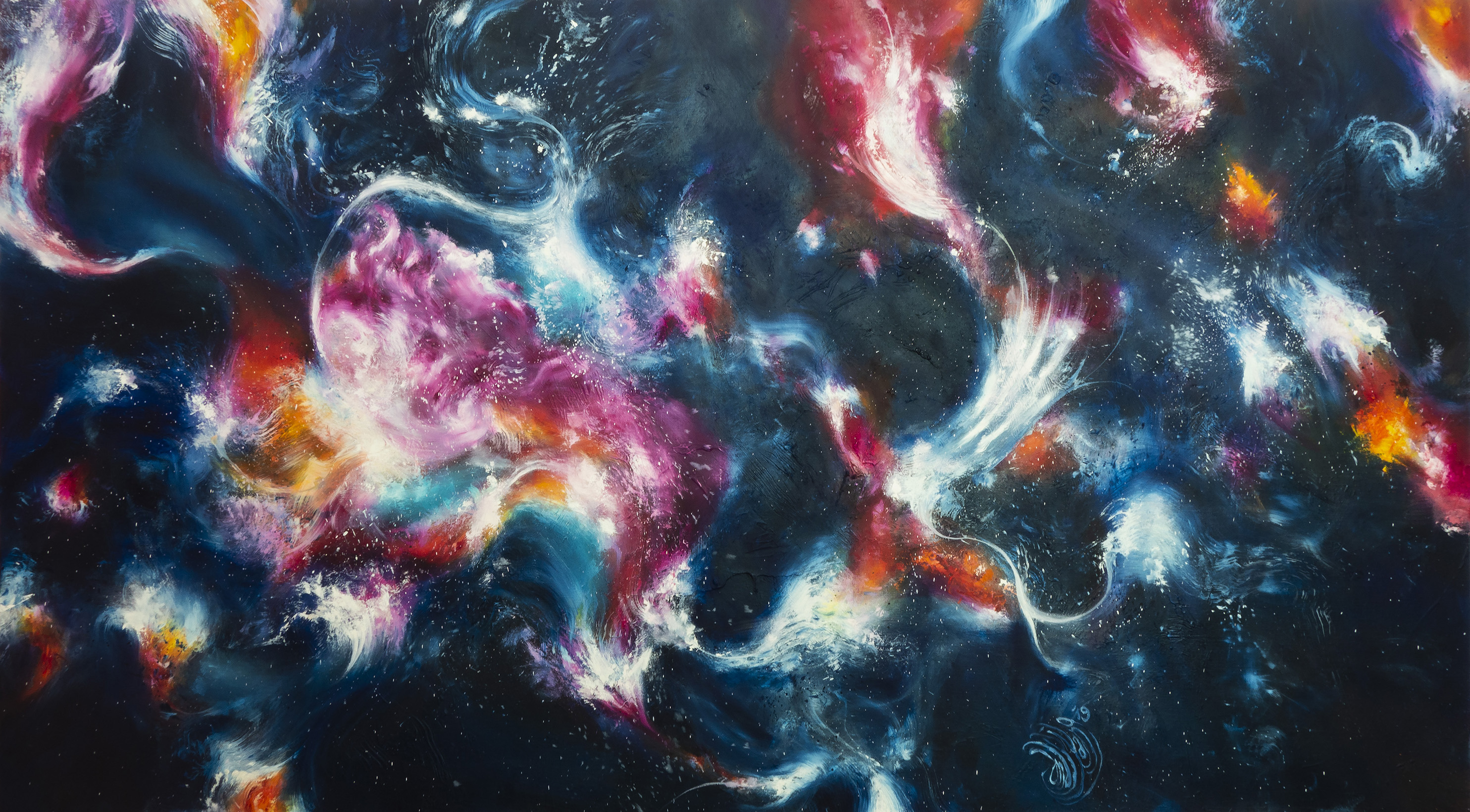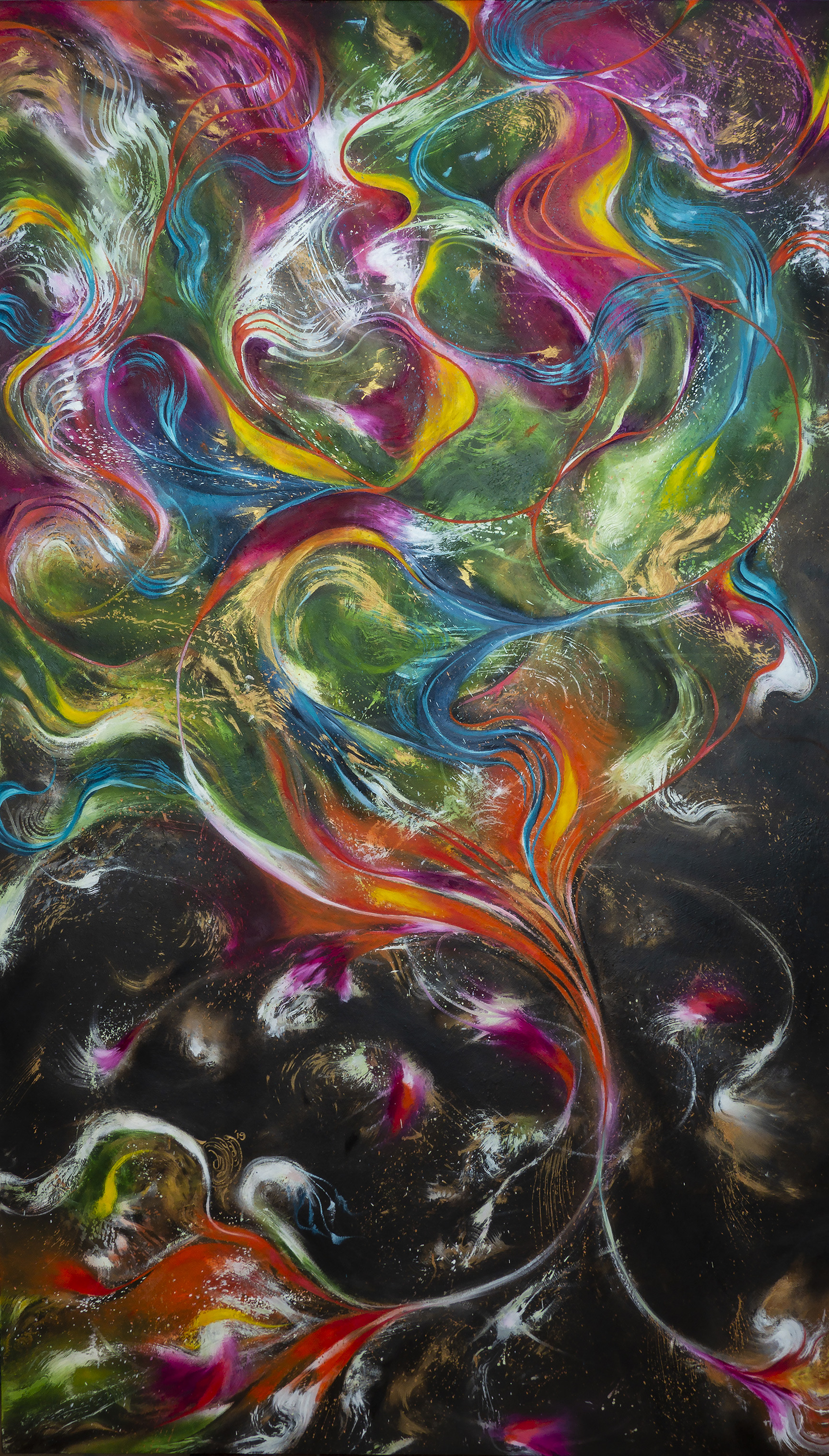 Between layers of plexiglass are gestures of Deusa Blümke, encased and amalgamated into an abstraction. Blümke’s unique process of ‘listening’ to shapes and colours synchronizes with Czech-born philosopher Vilem Flusser’s understanding that the painter “is in the gesture of painting.” This embodiment is further energized when Blümke views her paintings as live organisms in celebrating the energy and momentum of life. Tuning into the frequency of paint is also epitomized by Andy Yang. Operating under musical stimuli, Yang implements antithetical techniques to dilute his control as a deliberate action to allow various forms of gestures to harmonize. This approach is Yang’s independent Harmonic major scale in which he operates in.