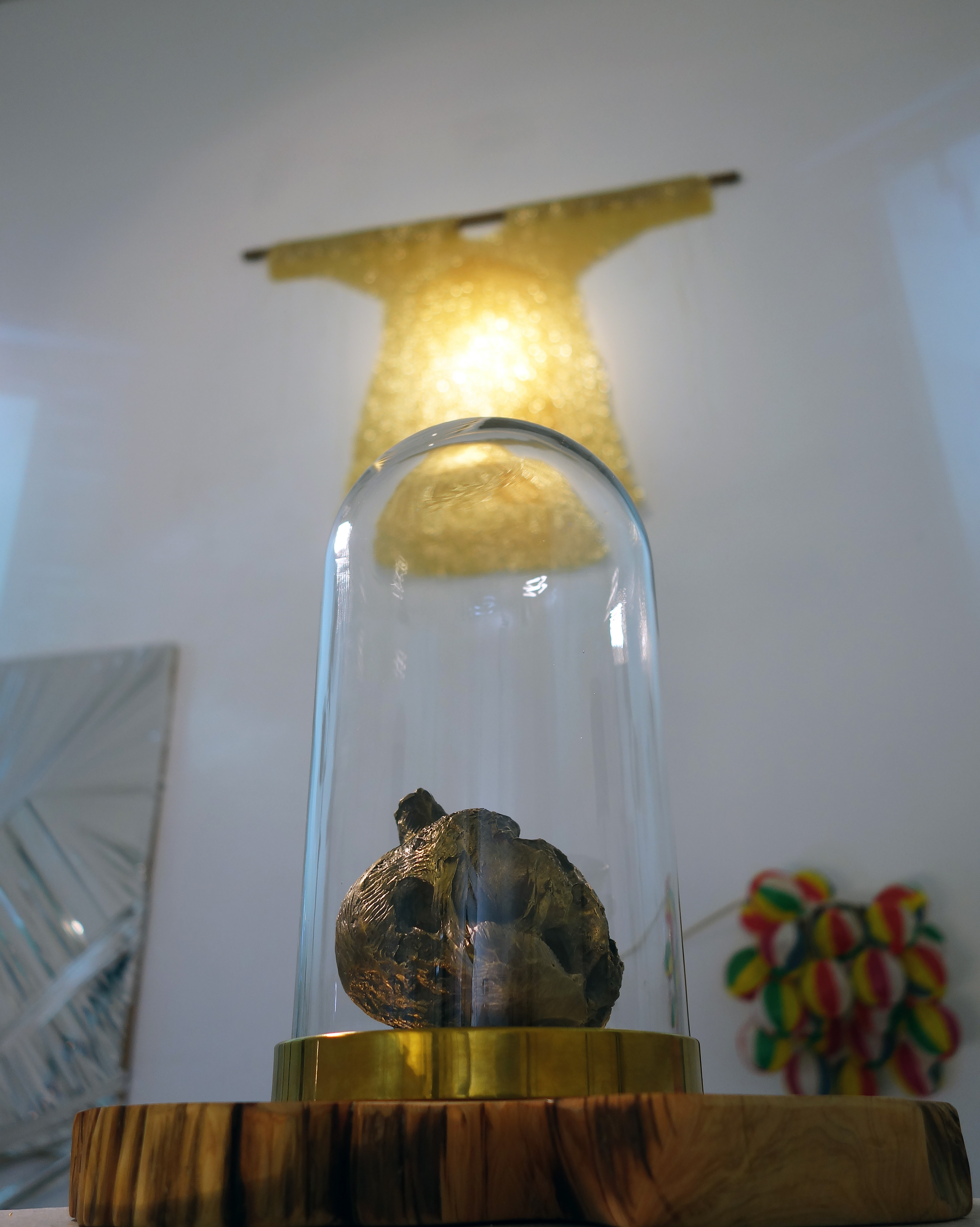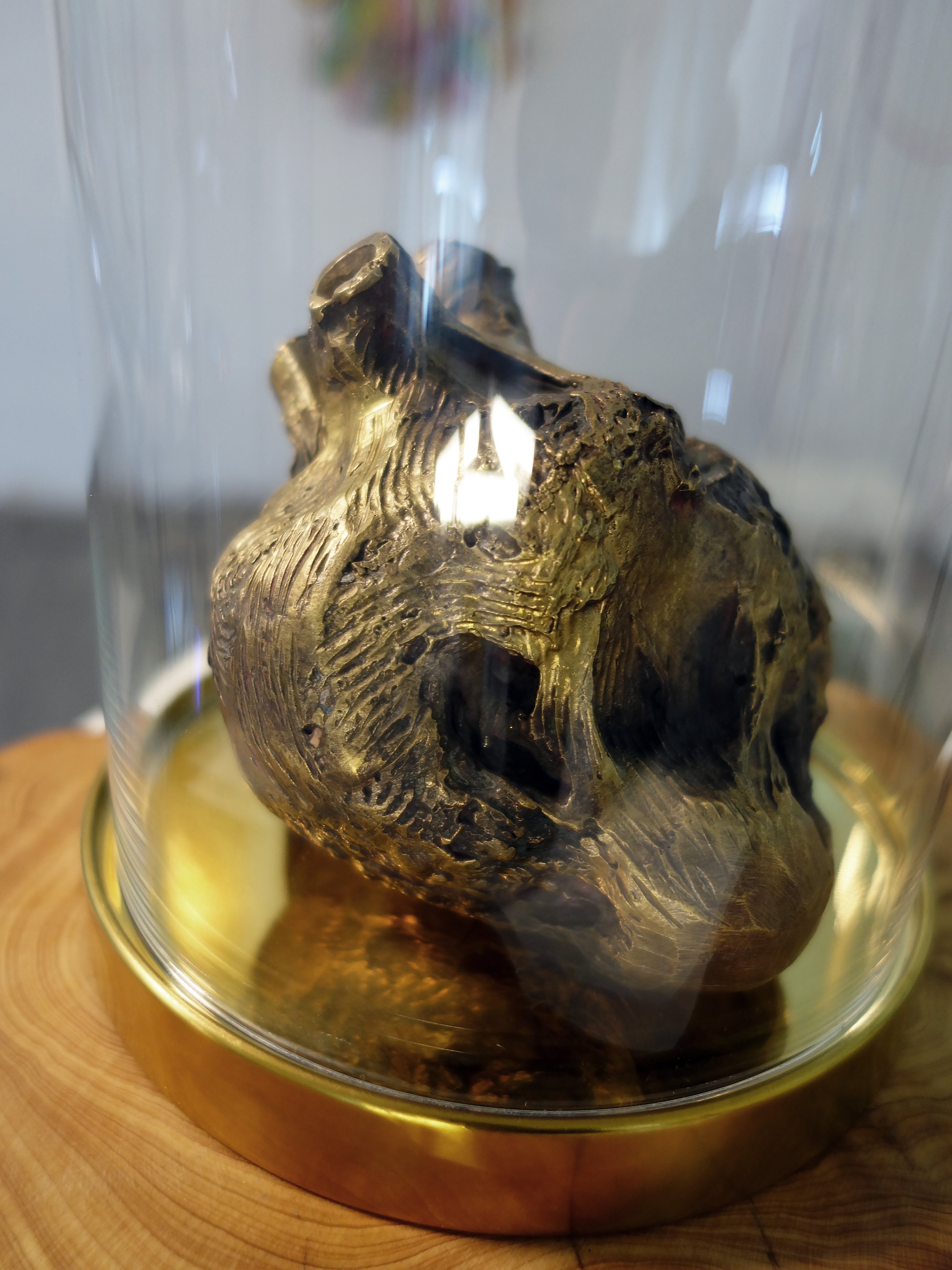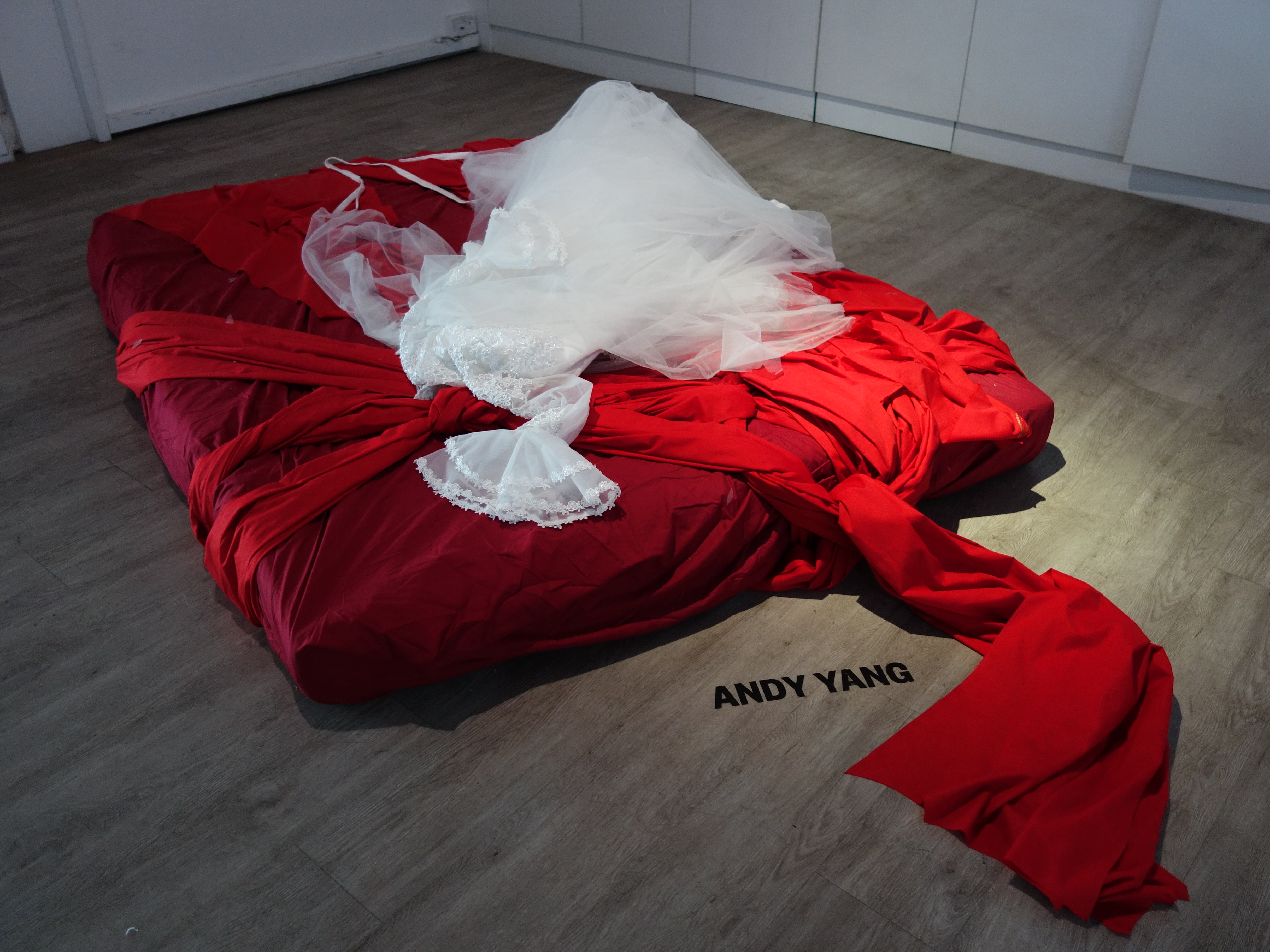 Medium – Latex mattress, wedding dress, red cloth, scissors, wax heart, bronze heart