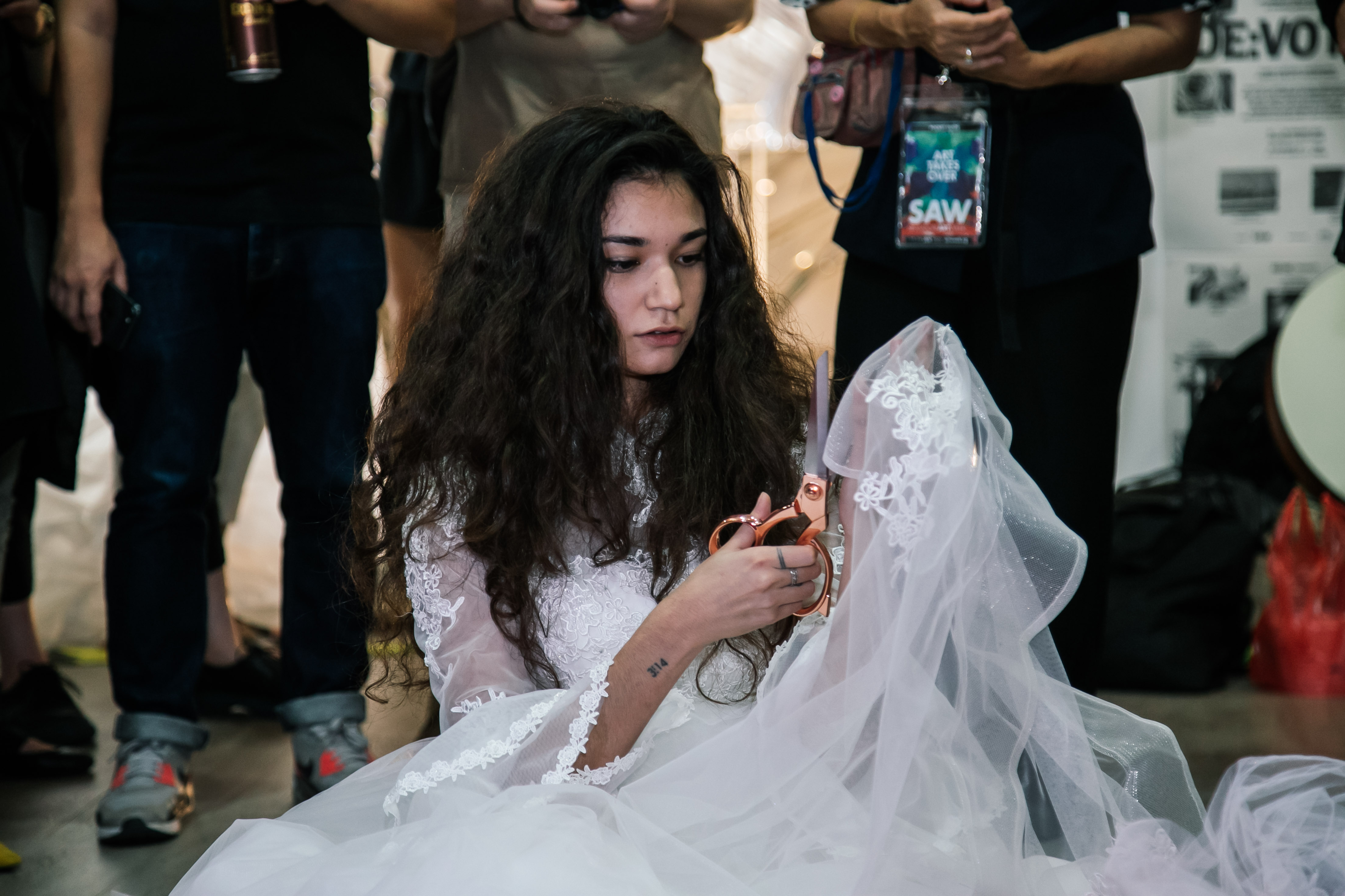 After numerous falls that represent the trials of the relationship, losing almost all hope of carrying on, she contemplates suicide. She picks up a pair of scissors. Feeling confused and half-hearted about taking her life, she starts to cut up her bridal gown, a former symbol of pride and happiness that has become a burden. She hands over to people around her as if seeking help from others to share her burdens. On the verge of ending it all, she stops.